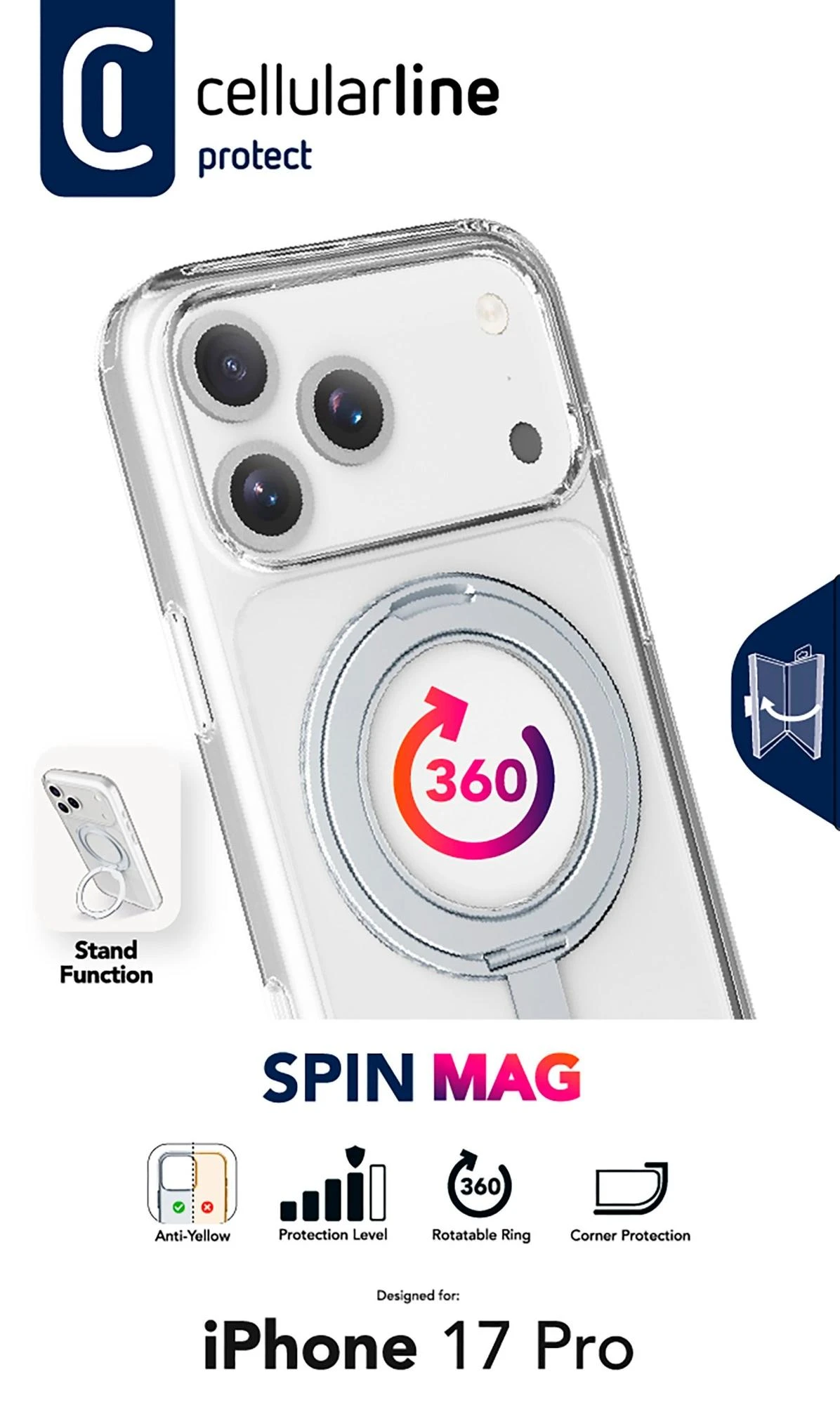 SPINMAG ist das transparente Etui mit drehbarem Standring, das mit dem MagSafe-Ökosystem vollständig kompatibel ist. Sein innovatives Design umfasst einen um 360° drehbaren Ring, der mehrere Funktionen bietet, wie z. B. die Möglichkeit, sich in einen Ständer oder Standfuß zu verwandeln. Der integrierte Ring wird zu einem festen Bestandteil des Gehäuses, wenn es nicht benutzt wird, und ist somit vollständig mit MagSafe-Zubehör kompatibel. Die erhöhten Ränder um das Display und die Kamera bieten zusätzlichen Schutz vor versehentlichen Stößen und Stürzen.
